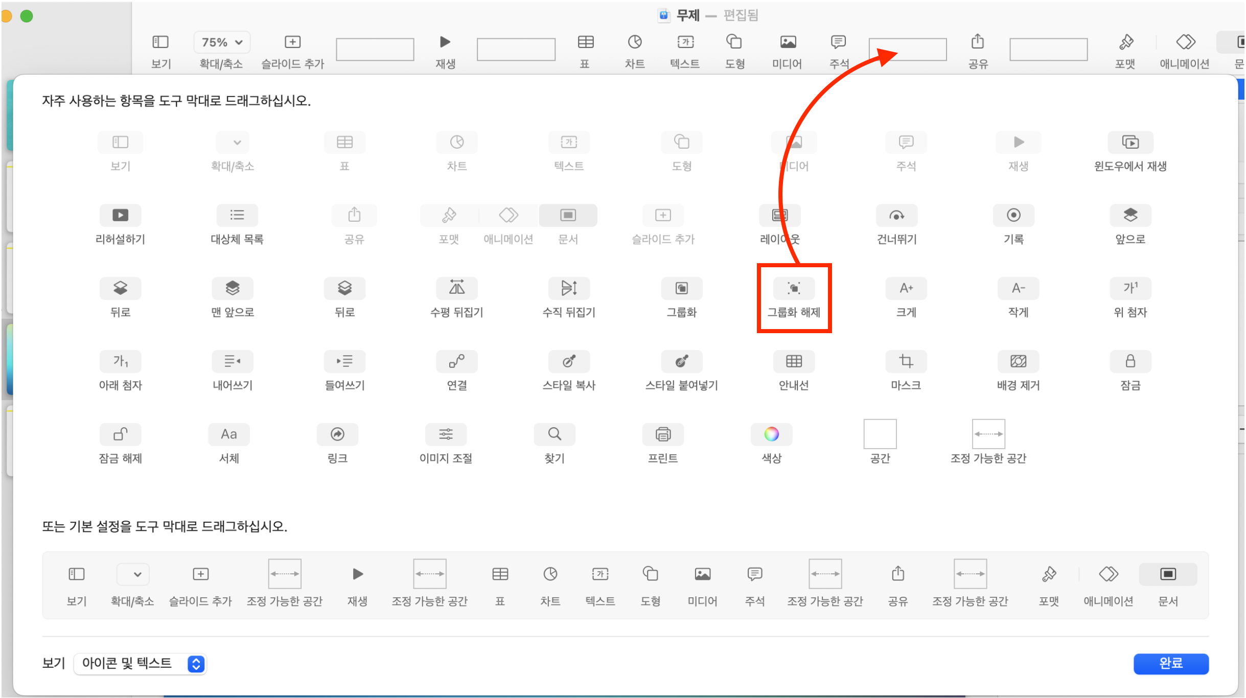 - 원하는 항목을 도구막대에 잡아서 드래그 추가하기