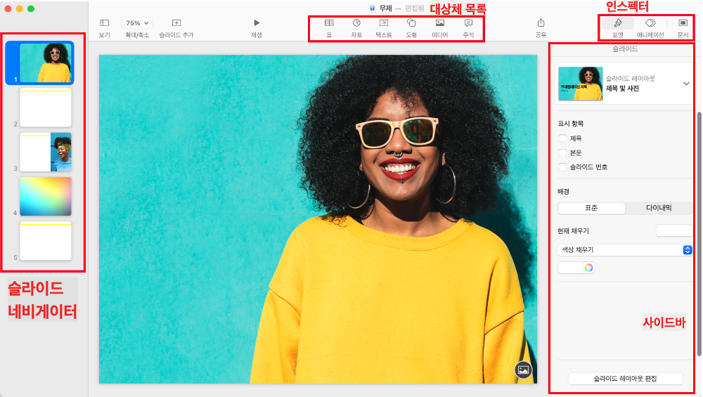 - 슬라이드 그룹화 : 하나 이상의 이미지 썸네일을 오른쪽으로 드래그하여 위의 슬라이드보다 들여 씁니다.