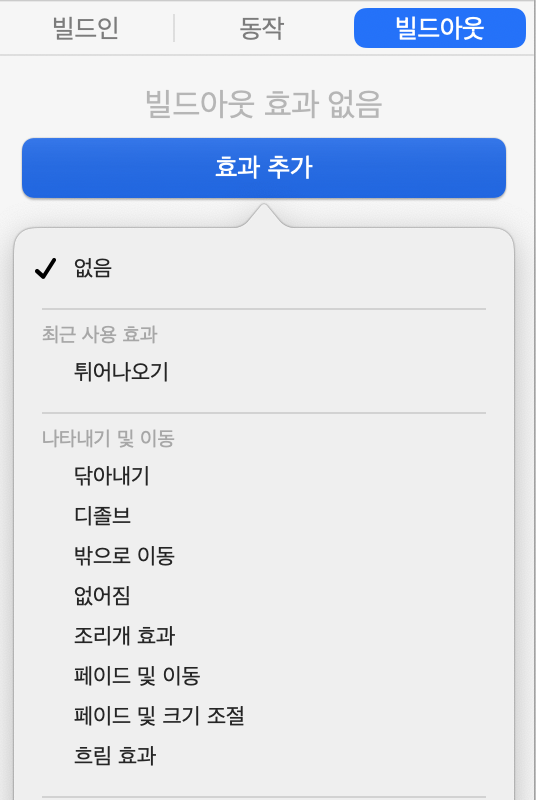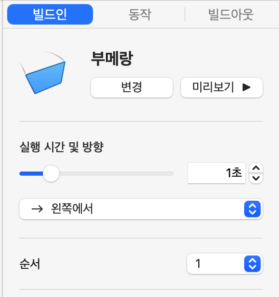 여러 객체에 애니메이션을 추가했다면, 사이드바의 ‘빌드 순서’ 탭에서 실행 순서를 드래그로 바꿀 수 있습니다. 예를 들어, 제목이 먼저 나타난 뒤 이미지가 따라오게 설정해보세요.
