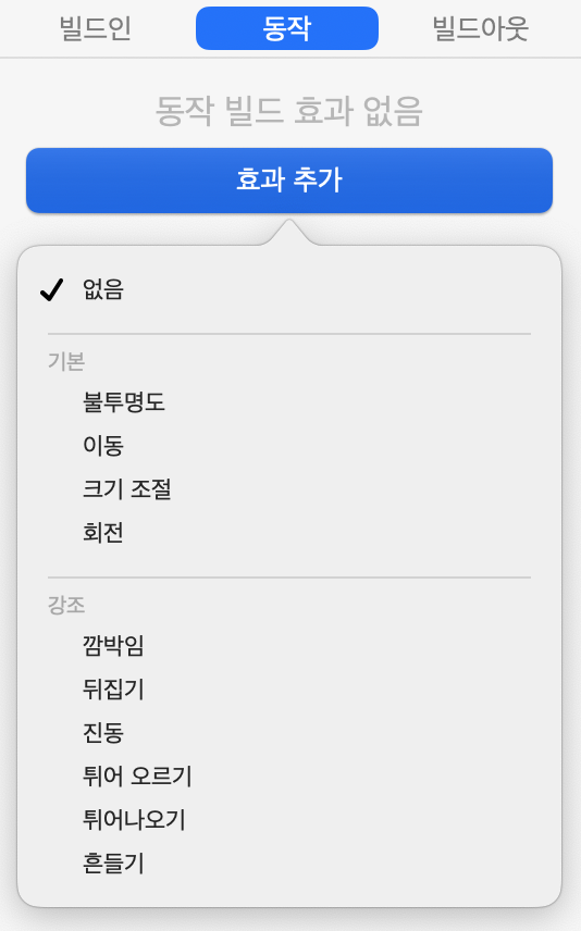 -강조(Action): 슬라이드 안에서 객체가 움직이는 효과 (예: 흔들기, 회전)