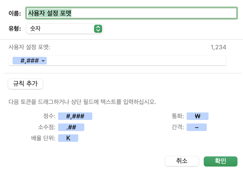 -재무 추적: “₩###,### KRW”로 설정해 “₩12,500 KRW”처럼 통화 단위를 강조.