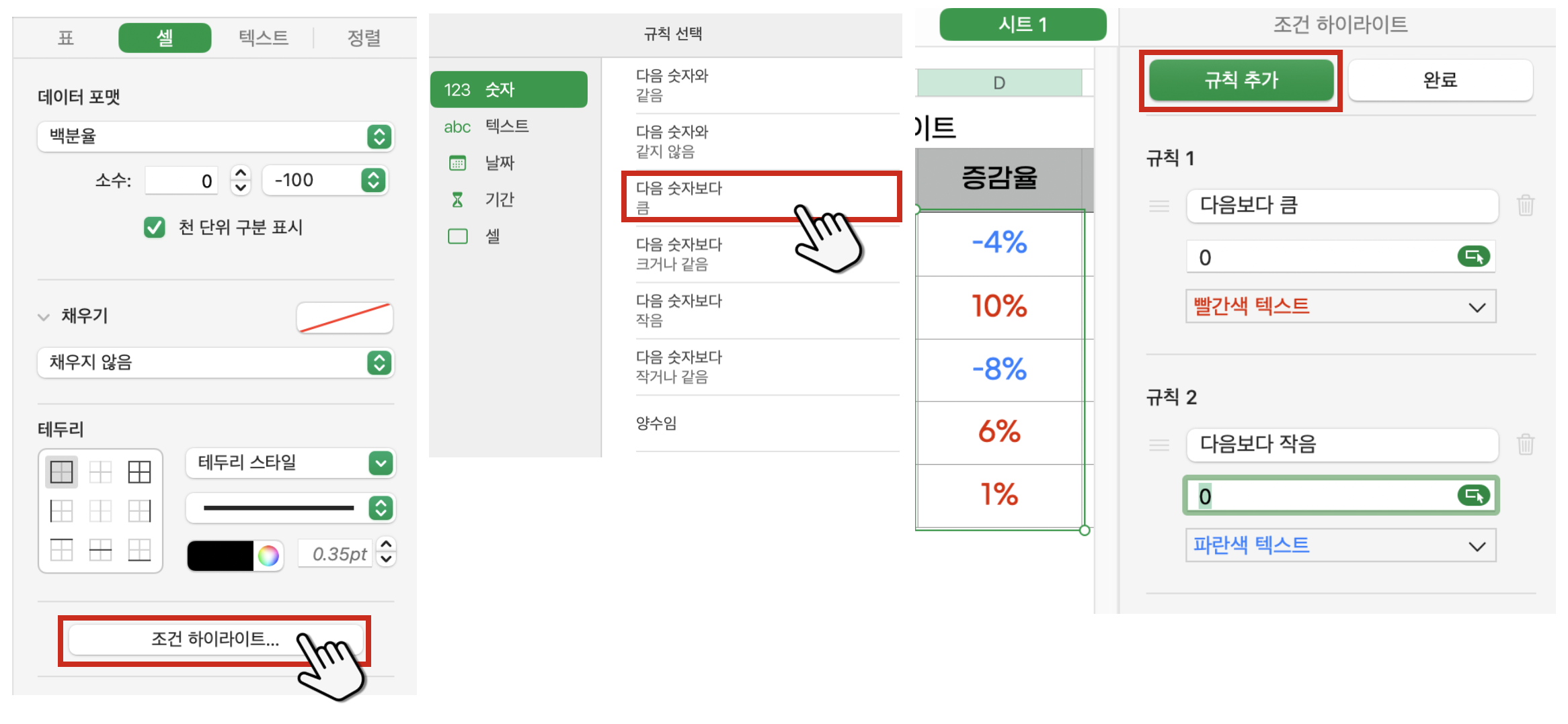 Numbers의 강력한 기능 중 하나는 조건부 하이라이트예요. 특정 조건(숫자 크기, 텍스트 포함 등)에 따라 셀을 자동으로 강조할 수 있어요. 예를 들어, 증감율이나 가격이 상승, 하락했을 때 하이라이트를 설정할 수 있습니다.