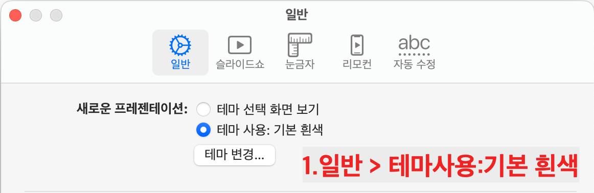 키노트에서 제공하는 다양한 디자인의 테마를 사용하지 않고 흰 페이지만 있는 슬라이드 프레젠테이션 파일을 항상 만들고 싶다면