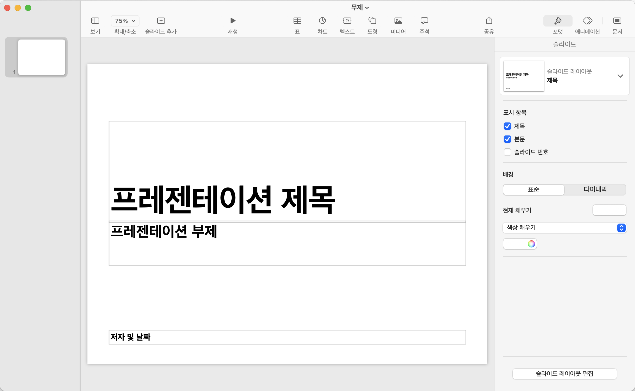 - 키노트에서 제공하는 테마별 디자인을 확인하기 : '슬라이드 레이아웃 편집' 버튼 누르면 해당 테마 슬라이드 디자인 확인 가능