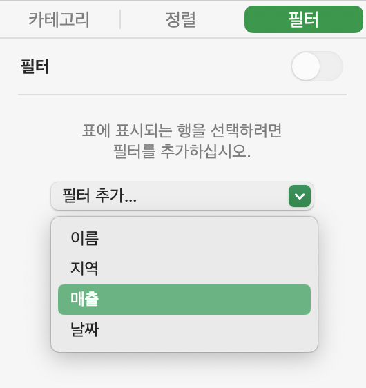 2. 필터 추가: ‘필터’ 탭에서 ‘필터 추가’를 클릭하고, 필터링할 열(예: ‘매출’)을 선택합니다.