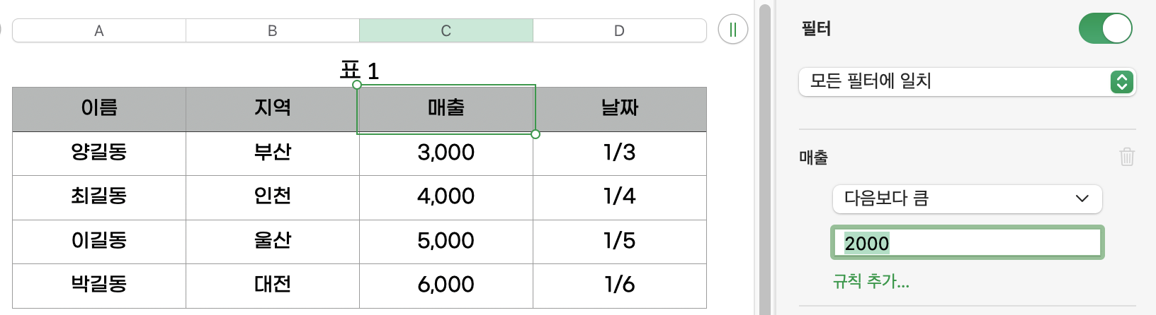 3.규칙 설정: 숫자 조건: ‘매출’ 열을 선택하고 ‘보다 큼’을 선택한 뒤 ‘2,000’을 입력하면 2000 초과 데이터만 표시됩니다.